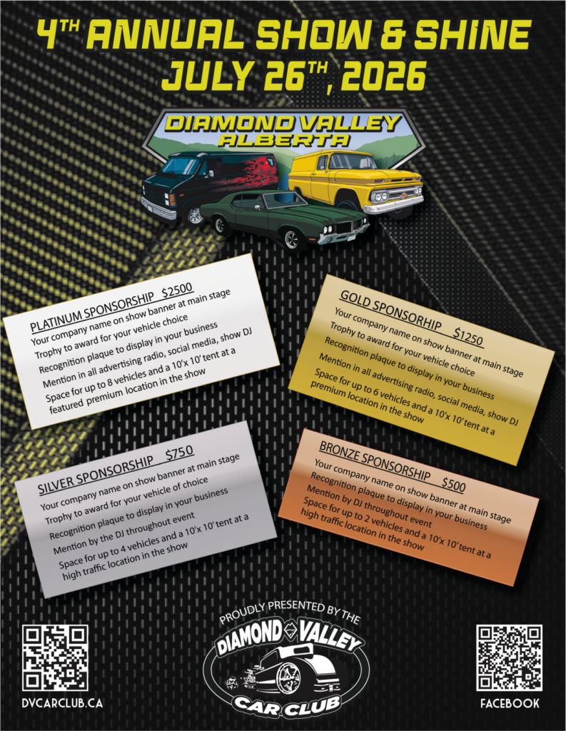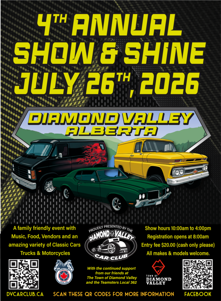 As with our 3 previous shows we benefit greatly from the unwavering support of the Town of Diamond Valley for allowing us to host this event along with Diamond Valley Fire Rescue and Diamond Valley Municipal Enforcement. The Teamsters Local 362 are back again this year with their dazzling mobile sound stage where the world famous Aaron the DJ from Okotoks will be providing the music, sponsor promotions and the awards presentations. We’re actively looking for more sponsors and vendors to make this event even better, give us a call / email or shoot us a message on Facebook……. let’s make 2026 a year to remember for all the right reasons.