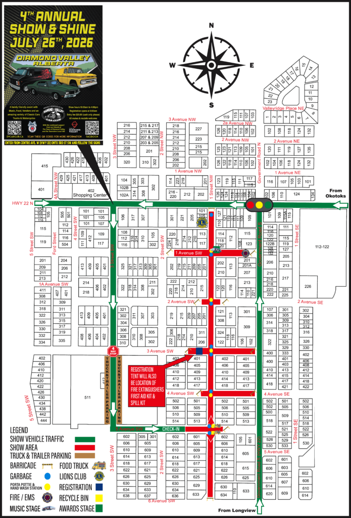 Okay, pay attention……. To get your vehicle into the show you’ll need to follow these simple directions. First you need to find the intersection of 3rd St SW and Centre Ave/Highway 22 which is 3 blocks west of the only traffic light in Diamond Valley. There is a strip mall on the NW corner of that intersection and there will be signs pointing you south. As you head south from that intersection on 3rd St SW you’ll see some sandwich board signs with arrows….follow them. If you are trailering your vehicle we have space for trucks and trailers on 3rd St SW in between 3rd and 5th Avenues by the Schools and Community rinks where the road widens. To get to the Check In station continue past the schools to 5th Ave and turn left. Proceed east on 5th Ave for a block and a half and the Check In table will be there waiting for you. Once you’ve paid the entry fee you will be given your registration card and then we can get you parked. There will be show officials directing you where to park so please follow their directions and instructions. If you are attending as a group please ensure you all enter at the same time and inform the parking officials of how many are in your group.